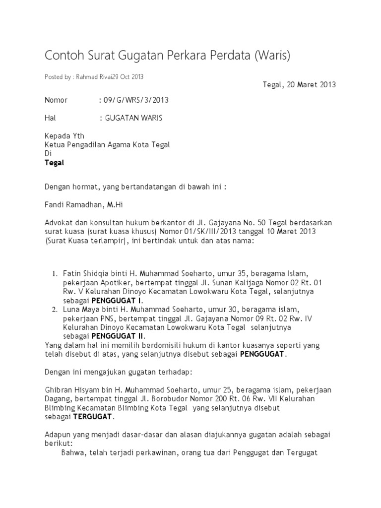 15 Contoh Surat Keterangan Ahli Waris Yang Resmi Dan Sah Surat Surat Kuasa Tanda Nama from i.pinimg.com Contoh surat kuasa ahli waris untuk pengurusan harta warisan pengurusan harta warisan yang ditinggalkan oleh orang yang telah meninggal dunia adalah hak dari ahli waris. Cara buat dan contoh surat keterangan bebas narkoba. Lain halnya jika ia sudah meninggal, persetujuan dari ahli waris menjadi penting. Di pengadilan agama muara tebo. Contoh surat warisan tanah dari orang tua kepada anak. Anda bisa menggunakan format ini sebagai acuan atau menggunakan format yang lain asal memiliki acuan yang sama dan sesuai dengan yang diharapkan oleh. Dan pada kesempatan yang berbahagia ini akan dibahas mengenai contoh gugatan waris. Atau boleh dikatan bahwa surat yang diberikan oleh pemilik warisan kepada ahli waris.